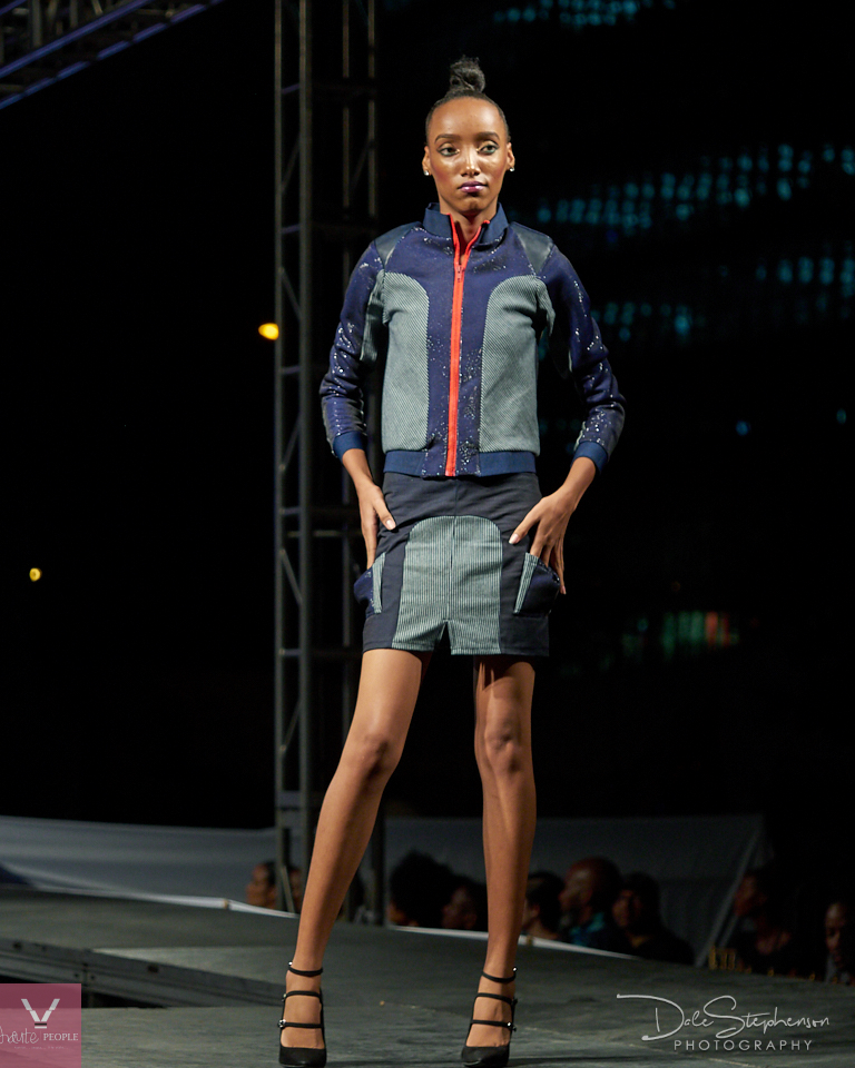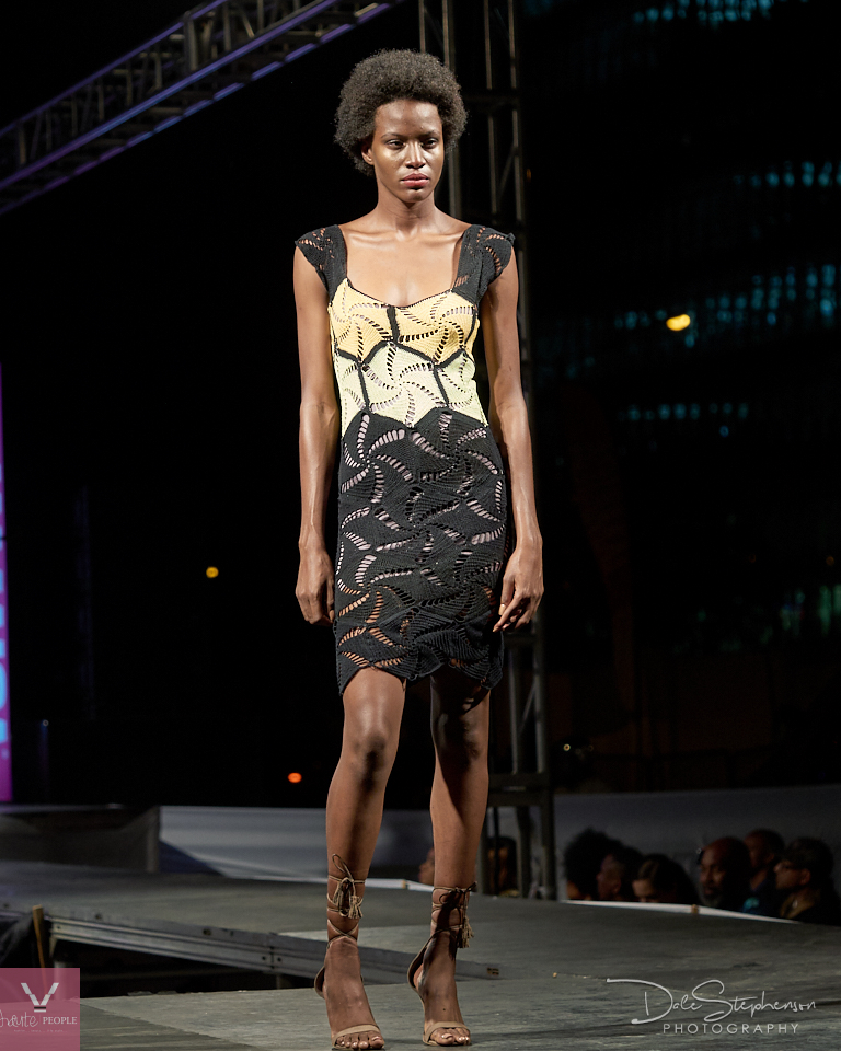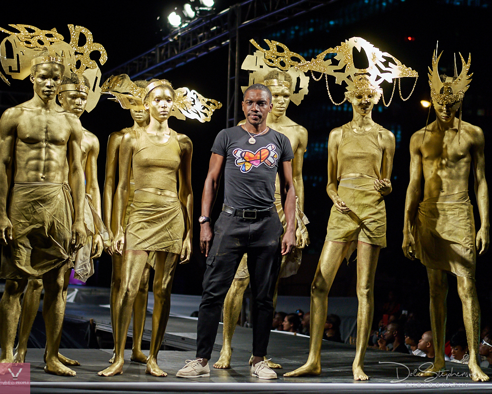The open-air and sea in the distance with high –rise buildings above gave a feel of a 1st world metropolitan city with exciting night-events. The lights dimmed and out walked beautiful golden models of the “Saint Army” with beautiful headpieces and mannequin-like poses as they made their way down the runway. We could feel the beat of the city as the show began with designs from House of Fennel by Designer Moses Fennel whose collection had hints of white, gold, black and a stand out deep-V dressed modeled by Nick Cummings.