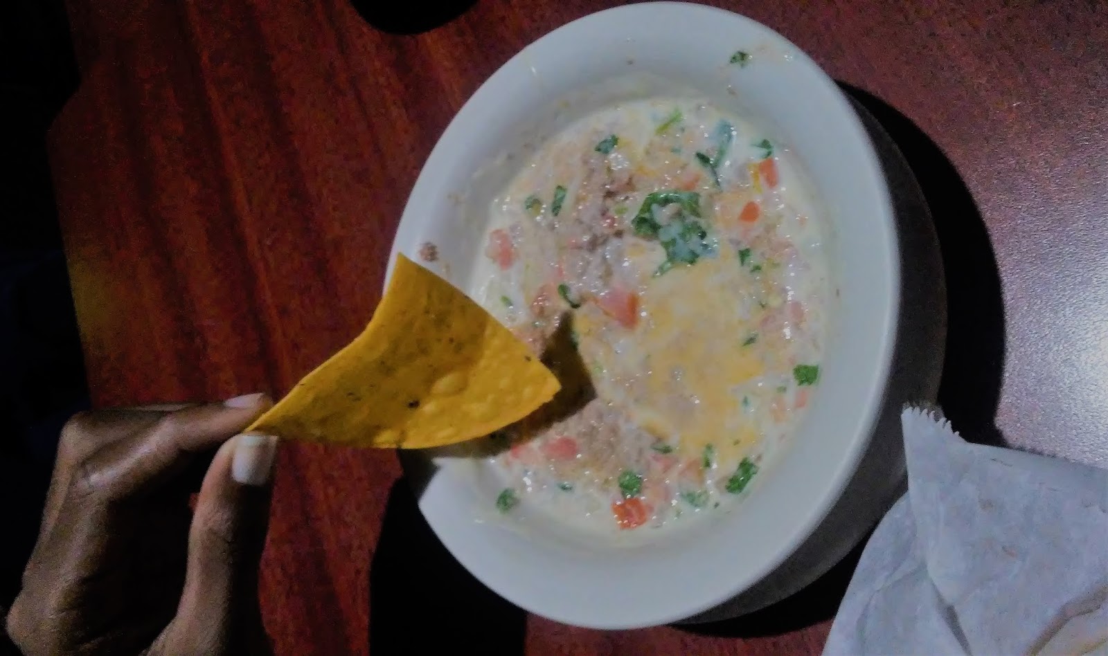 The first things that came were chips and salsa! As a Jamaican, I’m used to well-seasoned meals so the chips were a bit bland and the salsa cold! Not too long after that came the warm, cheese dip which was a hit at the table as it went really quickly.