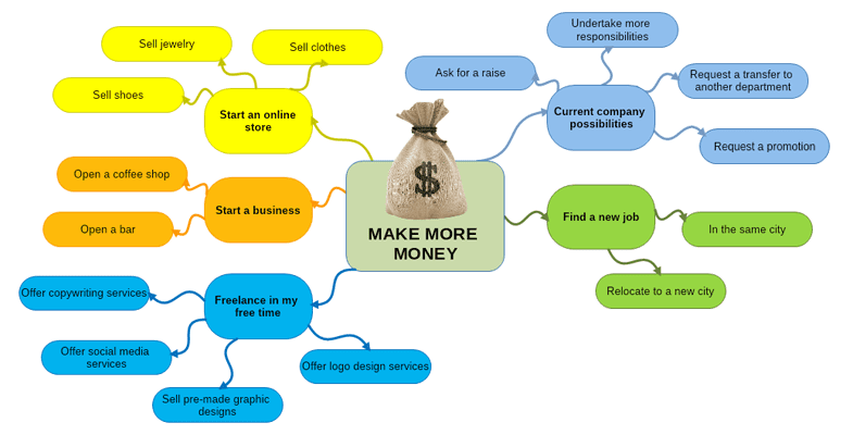 With that being said, you pretty much write all the ideas you have in mind in a flow chart with the main idea in the center. From these thoughts, you will put all the possible ideas in smaller circles or whatever shape you choose to radiate from that. Let’s say, for example, one of your goals for 2020 is to make an extra $100,000 per month. You would put “Make $100,000 per month” in the center then the ways you can do that: Ask for a raise, get a second job, sell products, dropshipping, sell services online and so on.